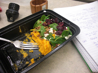 Home-packed dinner: green beans (gone), mashed sweet potatoes, and spinach salad, all with a small helping of midterm review.